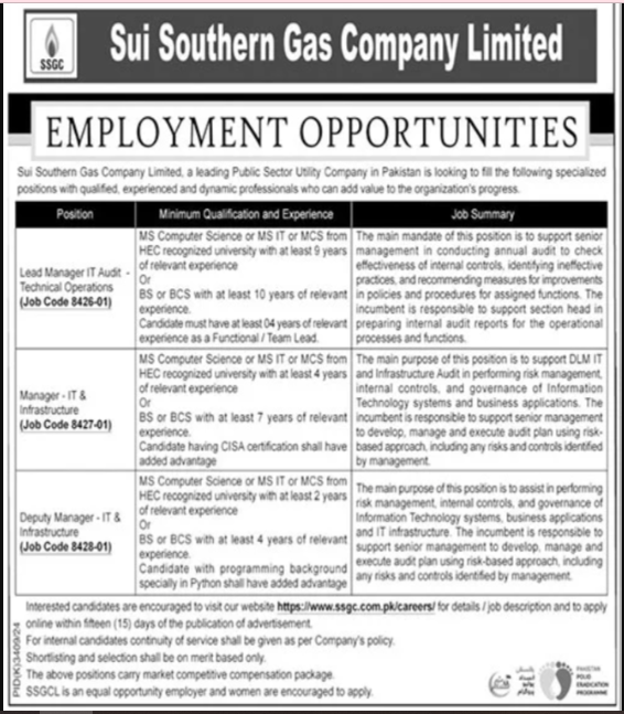 Only male candidates can apply for Sui Southern Gas Company Limited 2025 and the Qualification /Experience required: Computer Science, MS IT, MCS, and 10 years of experience. More experienced candidates should apply before 26 May 2025.